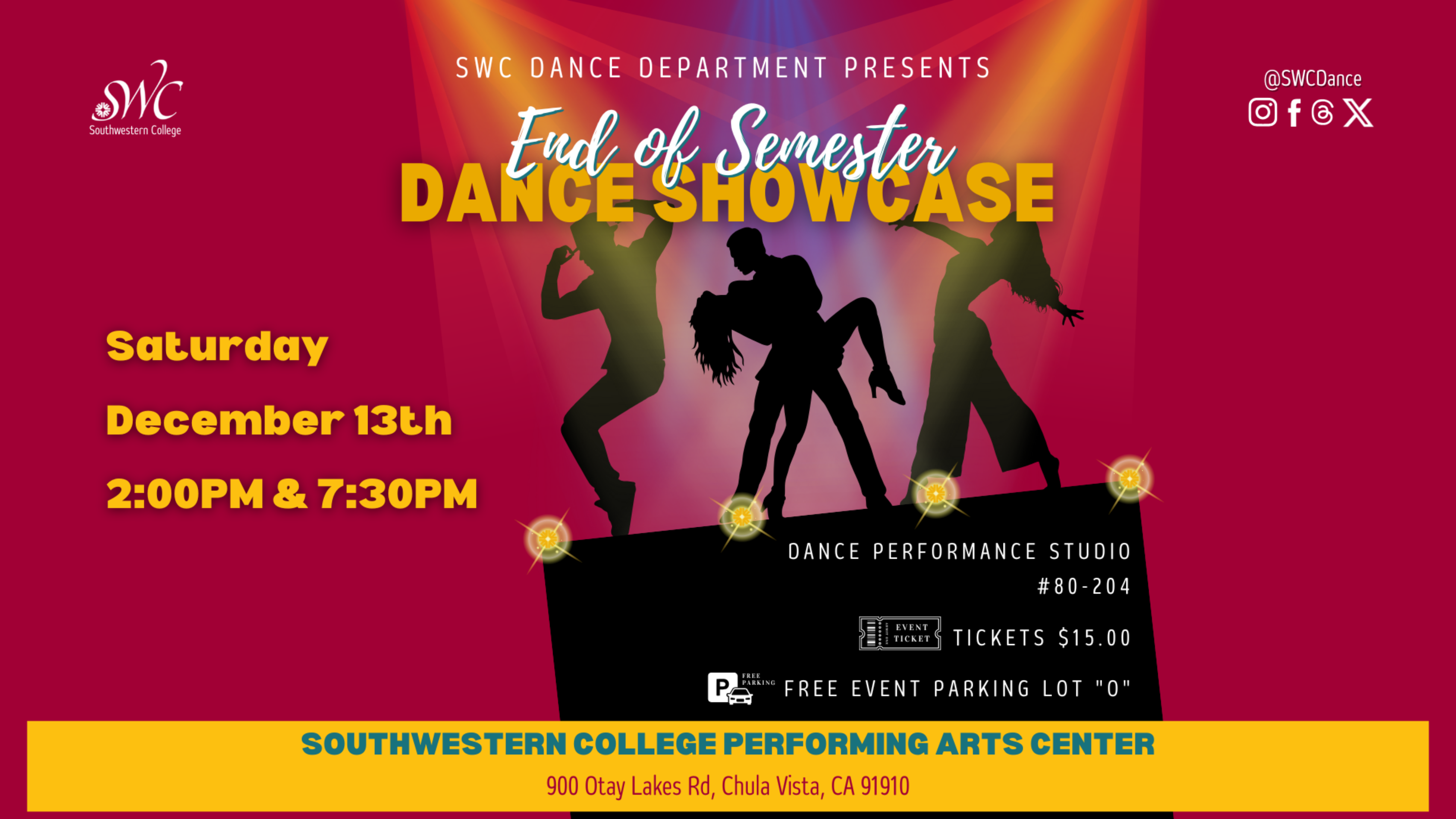 Southwestern College presents its end-of-the-semester dance showcase. All of the dance technique classes will be performing in an informal setting in our performance studio. There will be a variety of styles and music!
